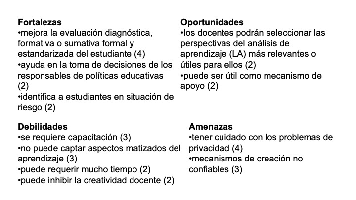 En las publicaciones, el feedback se centra principalmente en los estudiantes, incluidos aquellos de educación superior. Las observaciones generalmente muestran una mejora en el rendimiento (por ejemplo, +10% de calificaciones A y B en la Universidad de Purdue, EEUU). Para los profesores, el impacto de las AA es más complejo de evaluar. Los estudios basados en el modelo de aceptación de tecnología (TAM) sugieren que los profesores tienen una percepción positiva del uso de herramientas de AA. Un estudio muestra el análisis final de Fortalezas, Debilidades, Oportunidades y Amenazas (FODA) que reproducimos aquí5 (ver figura 3).