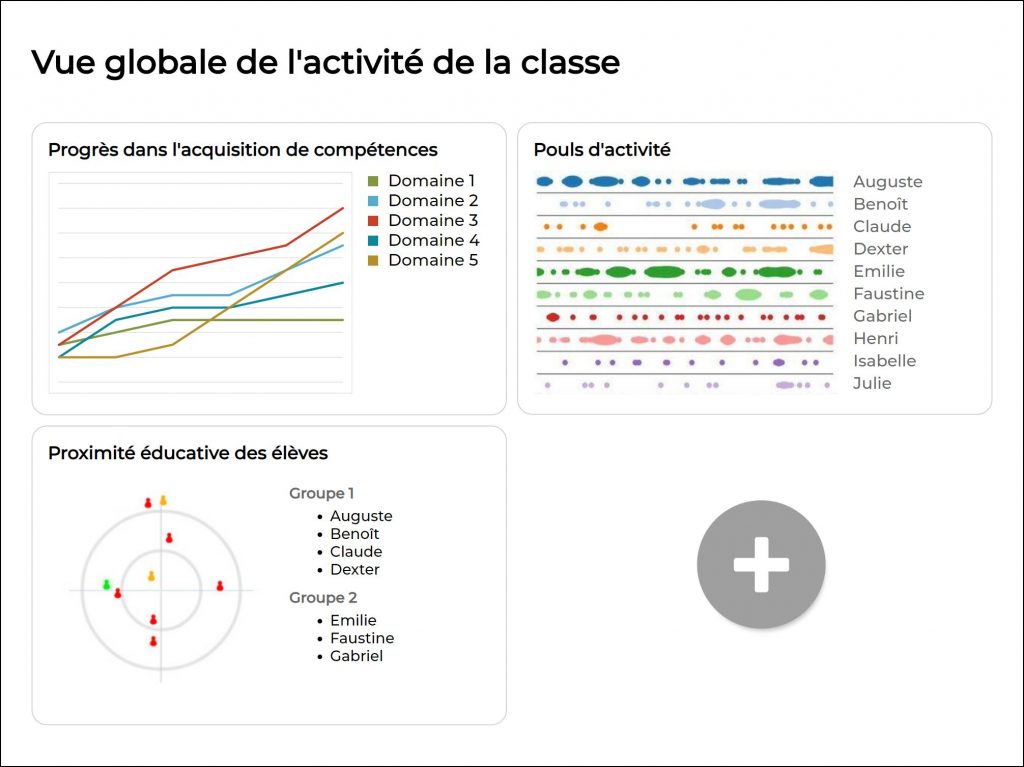 Las técnicas de AA pueden ayudar a modelar el comportamiento de aprendizaje de un estudiante o un grupo de estudiantes (es decir, una clase). El modelo se puede utilizar para mostrar procesos de aprendizaje en aplicaciones de AA, proporcionando información adicional que permitirá a los profesores detectar deficiencias que ayudarán a mejorar los materiales y métodos de formación. Además, el análisis del proceso de aprendizaje es una forma de observar el compromiso del estudiante. Por ejemplo, en el proyecto METAL e-FRAN, los indicadores se reunieron en un tablero co-diseñado con un equipo de profesores de secundaria como se muestra en la figura 23.