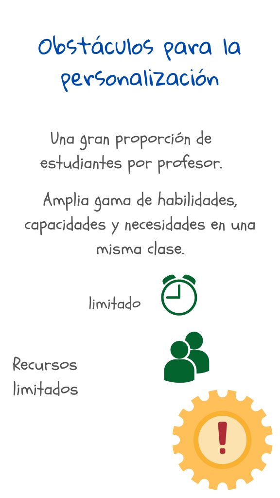 La tutoría uno a uno es el epítome de la personalización. En la década de 1960, Benjamin Bloom mostró que el estudiante promedio rinde mejor con tutoría individual. También demostró que la atención individual cierra la brecha de aprendizaje entre los estudiantes con altas y bajas calificaciones. En el aula real, incluso con diez estudiantes, personalizar el contenido para beneficiar a cada estudiante puede demandar mucho esfuerzo. La verdadera personalización es prácticamente imposible. Incluso cuando el profesor sabe que un estudiante tiene lagunas en el aprendizaje, podría ser incapaz de remediarlo debido a limitaciones de tiempo. Así, el sistema constantemente pierde estudiantes, incluso con el mejor esfuerzo de los profesores.