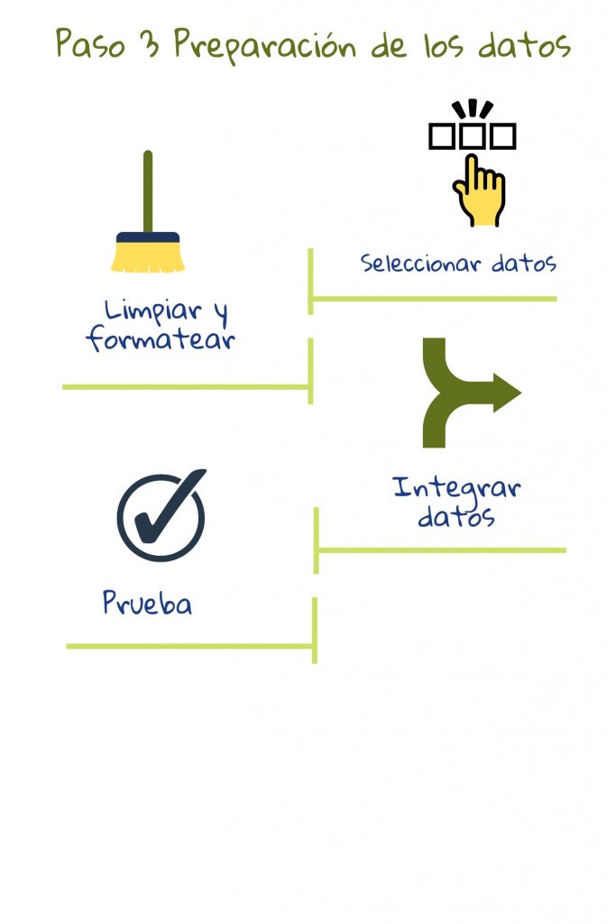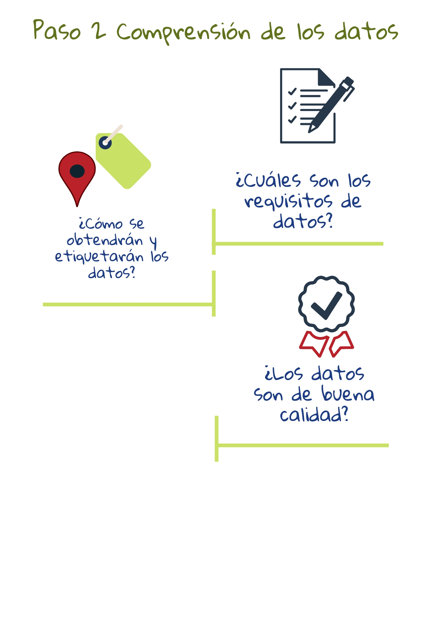 Una vez que los objetivos y factores contribuyentes son identificados, el enfoque se desplaza a qué datos son requeridos; cómo serán obtenidos y etiquetados; cómo se manejará la privacidad, y cómo se medirá la calidad de los datos3. Para que una aplicación de aprendizaje automático sea exitosa, los conjuntos de datos tienen que ser lo suficientemente grandes, diversos y bien etiquetados.