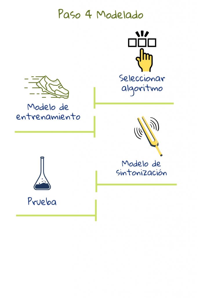 En este paso, se usan algoritmos para extraer patrones en los datos y crear modelos. Usualmente, se prueban diferentes algoritmos para ver qué funciona mejor. Estos modelos pueden entonces ser puestos en uso para hacer predicciones sobre nuevos datos.