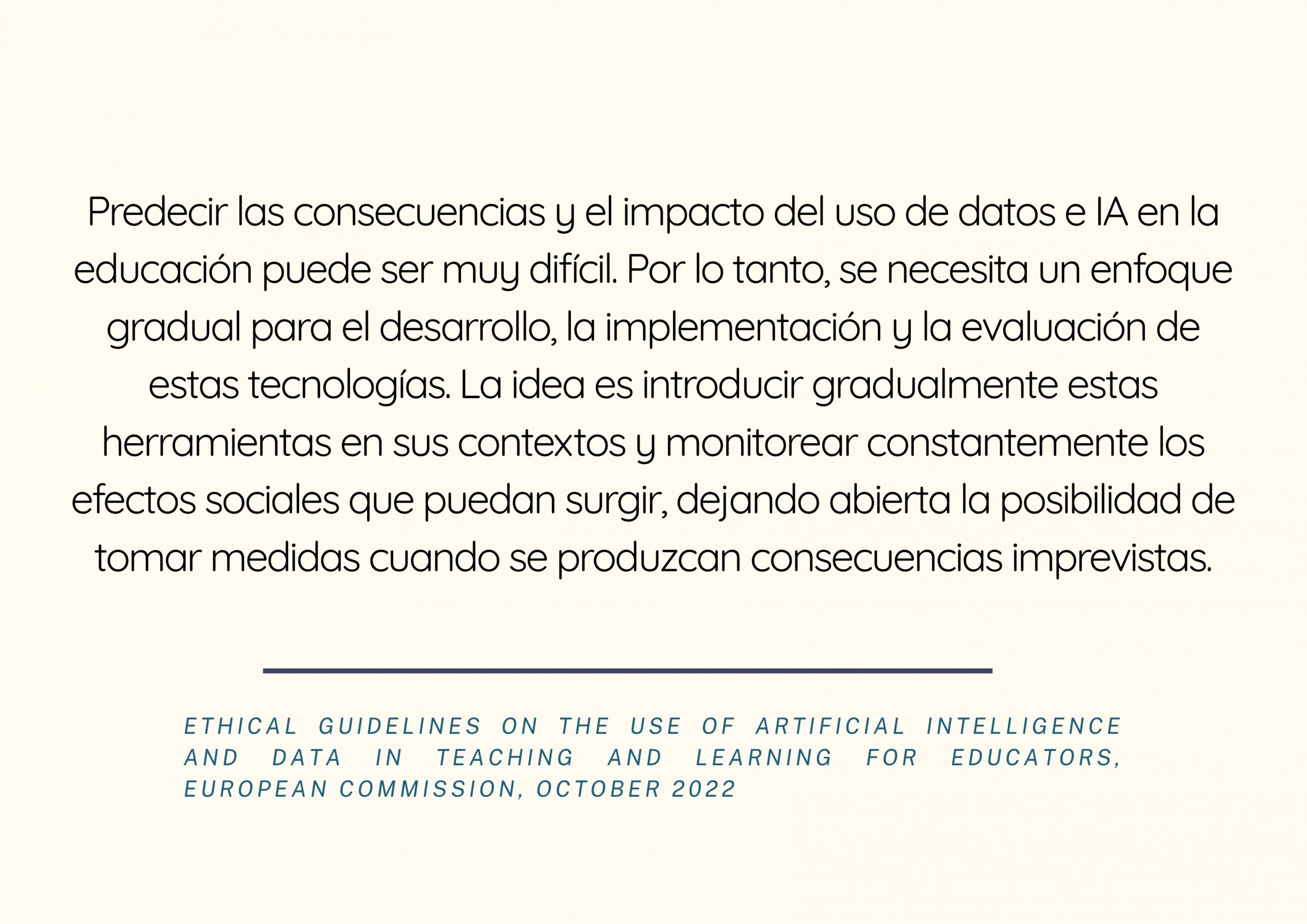 Hay muchas idas y vueltas entre los dos primeros pasos ya que lo que es posible también dependerá de qué datos están disponibles2. Además, el diseño de herramientas educativas también está sujeto a leyes que imponen restricciones sobre el uso de datos y tipos de algoritmos que pueden ser usados.