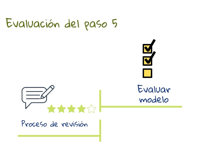 Durante la etapa de modelado, cada modelo puede ser ajustado para precisión de predicción en el conjunto de datos de entrenamiento. Luego los modelos son probados en el conjunto de prueba y se elige un modelo para su uso. Este modelo también es evaluado en cómo cumple con las necesidades educativas: ¿Se cumplen los objetivos establecidos en el paso 1? ¿Hay algún problema imprevisto? ¿Es la calidad buena? ¿Podría algo ser mejorado o hecho de otra manera? ¿Se necesita un rediseño? El objetivo principal es decidir si la aplicación puede ser desplegada en los espacios educativos. Si no, todo el proceso se repite2.