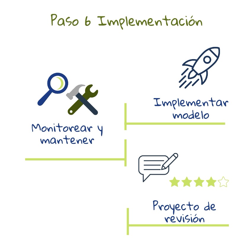 Aunque se da como el paso final, todo el proceso es interactivo. Después del despliegue, el modelo debería ser revisado regularmente para verificar si todavía es relevante para el contexto. Las necesidades, procesos o modos de captura de datos podrían cambiar afectando la salida del sistema. Por lo tanto, la aplicación debería ser revisada y actualizada cuando sea necesario. El sistema debería ser monitoreado continuamente por su impacto en el aprendizaje, la enseñanza y la evaluación6.