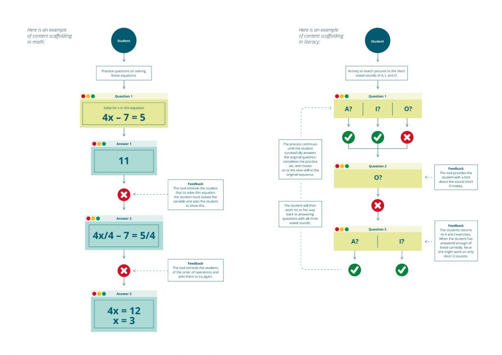 Las herramientas que usan AA utilizan grandes conjuntos de datos sobre el rendimiento real de los estudiantes y son capaces, con el tiempo, de crear los caminos de aprendizaje más dinámicos para los estudiantes1. Como en todas las aplicaciones de AA, hay entrenamiento y pruebas que se deben realizar antes de ser utilizadas en las aulas.