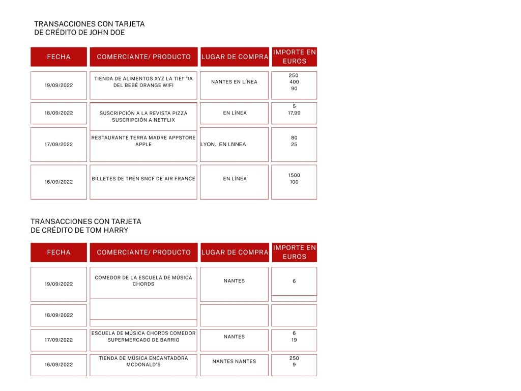 Estas son las transacciones con tarjeta de crédito de John Doe y Tom Harry, dos hombres que viven en Nantes, Francia. Están buscando cosas que hacer este fin de semana. ¿Qué les recomendarías?