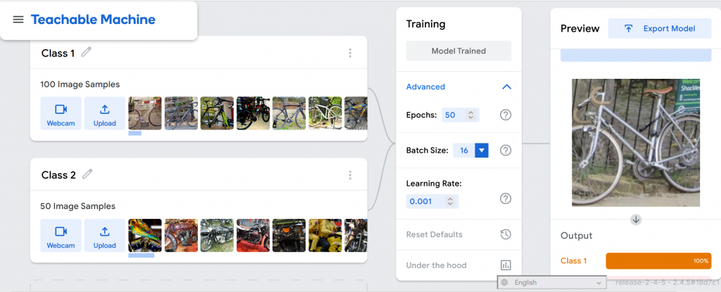 Utilizaremos Google’s teachable machine para entrenar a una máquina a clasificar una imagen como bicicleta o motocicleta. Recapitulando, una aplicación de AA debe entrenarse y probarse antes de poder utilizarse. Reuniremos y agruparemos imágenes de muestra de las categorías que la máquina clasificará, entrenaremos el modelo y probaremos si clasifica correctamente un conjunto de imágenes de ejemplo.