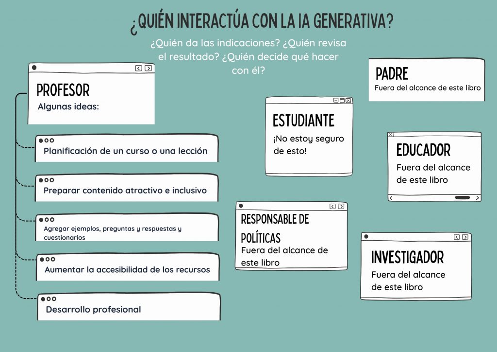 Por favor nota que en este libro solo miramos aquellas actividades donde el profesor, no el estudiante, interactúa con la IAG. Nuestras razones detrás de esto se explican en el enlace proporcionado en el cuadro.