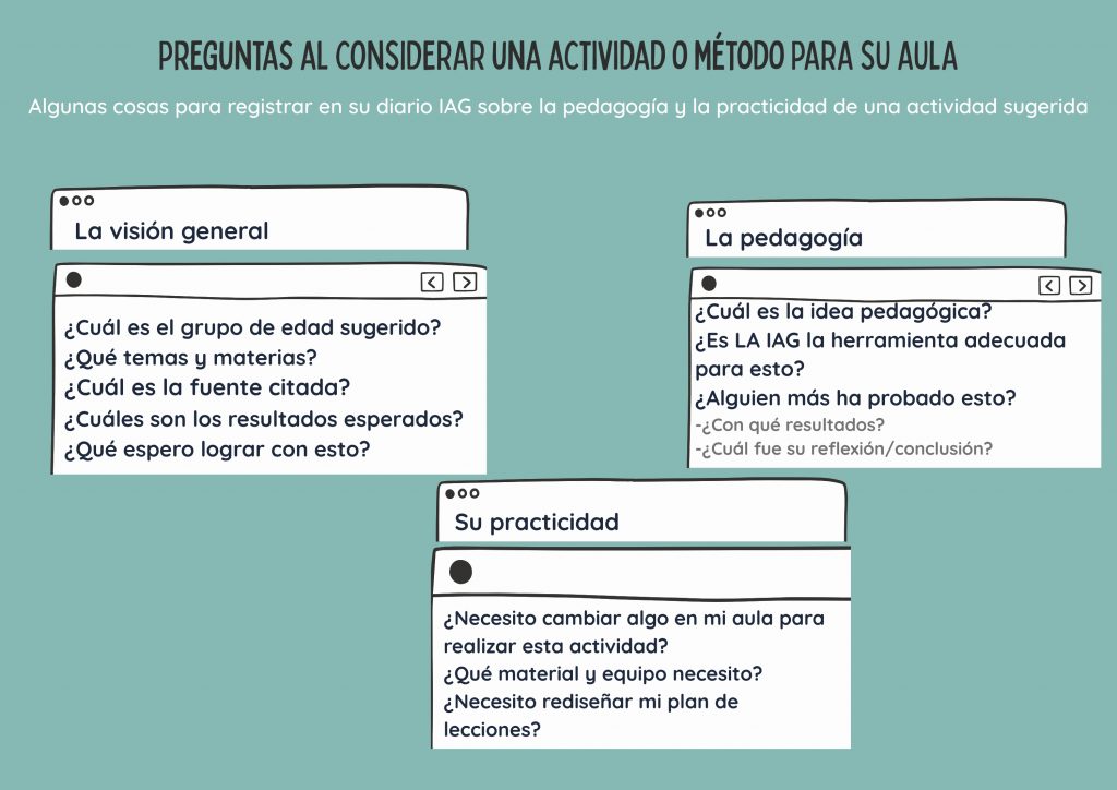 Cualquiera puede sugerir una actividad para el aula. Podría suceder que provengan del mundo de la tecnología y tengan poco entendimiento de la situación del aula. O, podría ser una idea que funciona para un estudiante universitario pero no para un adolescente. Incluso si la actividad es adecuada para tu aula, si no está respaldada por una teoría pedagógica confiable y evidencia, podría producir algunas sorpresas a largo plazo. Por lo tanto, te alentamos a acercarte a cualquier actividad con preguntas sobre pedagogía y practicidad.