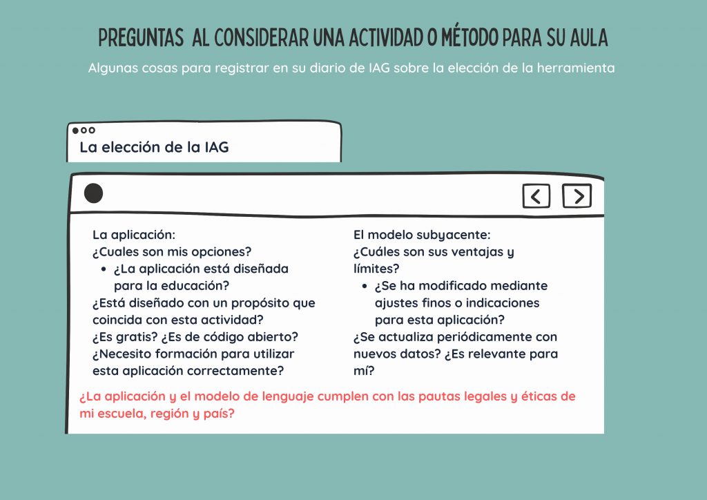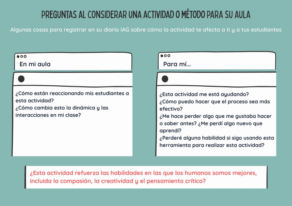 Debido a la velocidad de evolución de esta tecnología y dado cómo los rendimientos cambian con los sujetos y contextos, todas las preguntas que un profesor necesita hacer no pueden ser listadas de antemano. Esperamos solo comenzar a guiarte en líneas de pensamiento recomendadas por guías publicadas y respaldadas por investigación y estudios de caso.