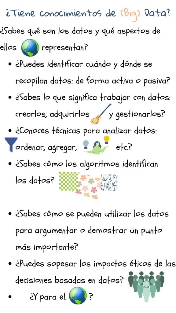 La práctica general de guardar todo tipo de datos se denomina Big Data1. Hacer esto tiene sentido desde que el almacenamiento de datos se ha abaratado y los potentes procesadores y algoritmos (especialmente el procesamiento del lenguaje natural y el AA) facilitan el análisis de los big data2.