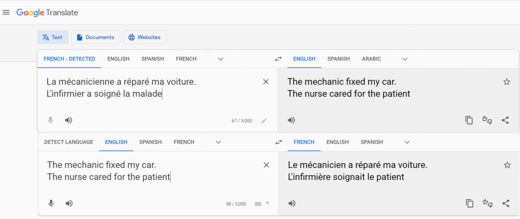 Idiomas como el turco tienen la misma palabra para ‘él’ y ‘ella’. Muchos estereotipos salen a la luz al traducir del turco y a la inversa. Note que muchos idiomas tienen un sesgo masculino: se asume que una persona desconocida es hombre. Esto no es un sesgo de la aplicación. Lo impactante en nuestro ejemplo anterior es que el enfermero masculino se cambia a femenino.